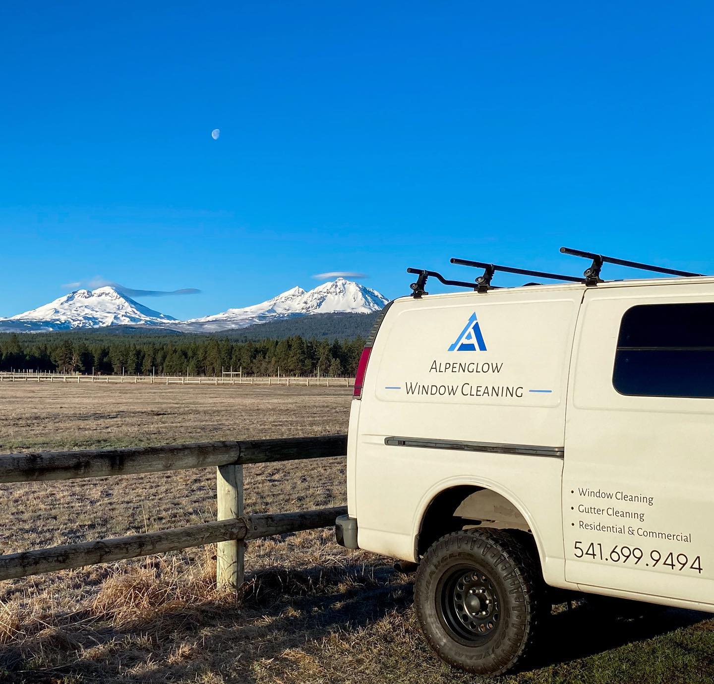 Alpenglow Window Cleaning - Providing a high level of service in window cleaning, gutter cleaning and pressure washing in Sisters, Bend, Redmond and surrounding areas. Alpenglow Window Cleaning is a family owned and operated company based in Sisters, OR. Owner William discovered window cleaning through his love of climbing. Over a number of years, he has developed extensive experience in both residential and high-rise work. When he isn't out cleaning windows, will enjoys spending time mountain biking, off-roading, and camping in the mountains of Oregon with his partner and their dog.