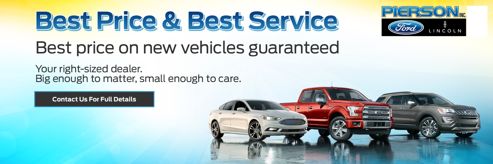 We here at Pierson Ford Lincoln Inc. have made it our mission to provide a first class car-shopping experience to our valued customers throughout Aberdeen, Groton, Ellendale and Ipswich. With our vast selection of new and used cars, you'll have the chance to browse our current inventory in a comfortable, stress-free shopping environment. Visit us to take a test drive, learn more about financing or service your car and we can assure that you'll always be well taken care of!